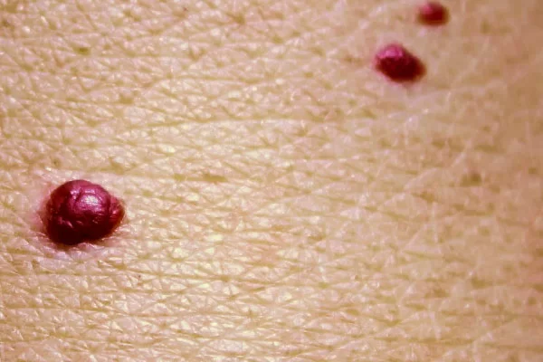 Los angiomas son manchas rojas o violáceas que pueden aparecer en diferentes partes del cuerpo. Estas manchas son causadas por agrandamiento anormal de los vasos sanguíneos en la piel. Pueden tener forma de puntos rojos (conocidos como puntos rubí), manchas planas o abultadas. Los angiomas pueden variar en tamaño y cantidad, y suelen ser inofensivos desde el punto de vista médico.