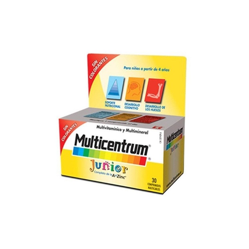 Multicentrum Junior, complemento alimenticio que contiene vitaminas esenciales, oligoelementos y luteína para reforzar la ingesta d e estos micro-nutrientes en una alimentación variada y asegurar un buen estado de salud.